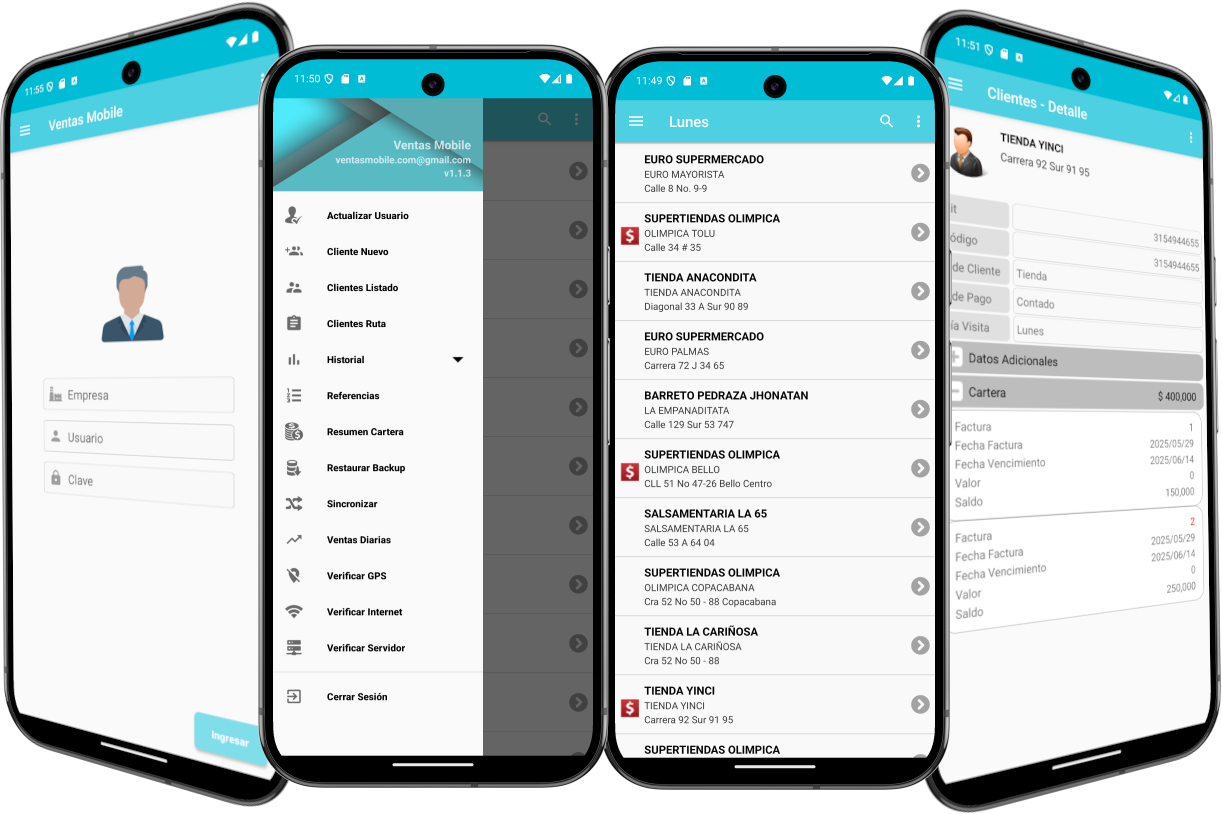 Ventas Mobile centraliza la operación comercial en una sola solución, integrando clientes, pedidos, rutas y visitas en un entorno diseñado para trabajar de manera online y offline.